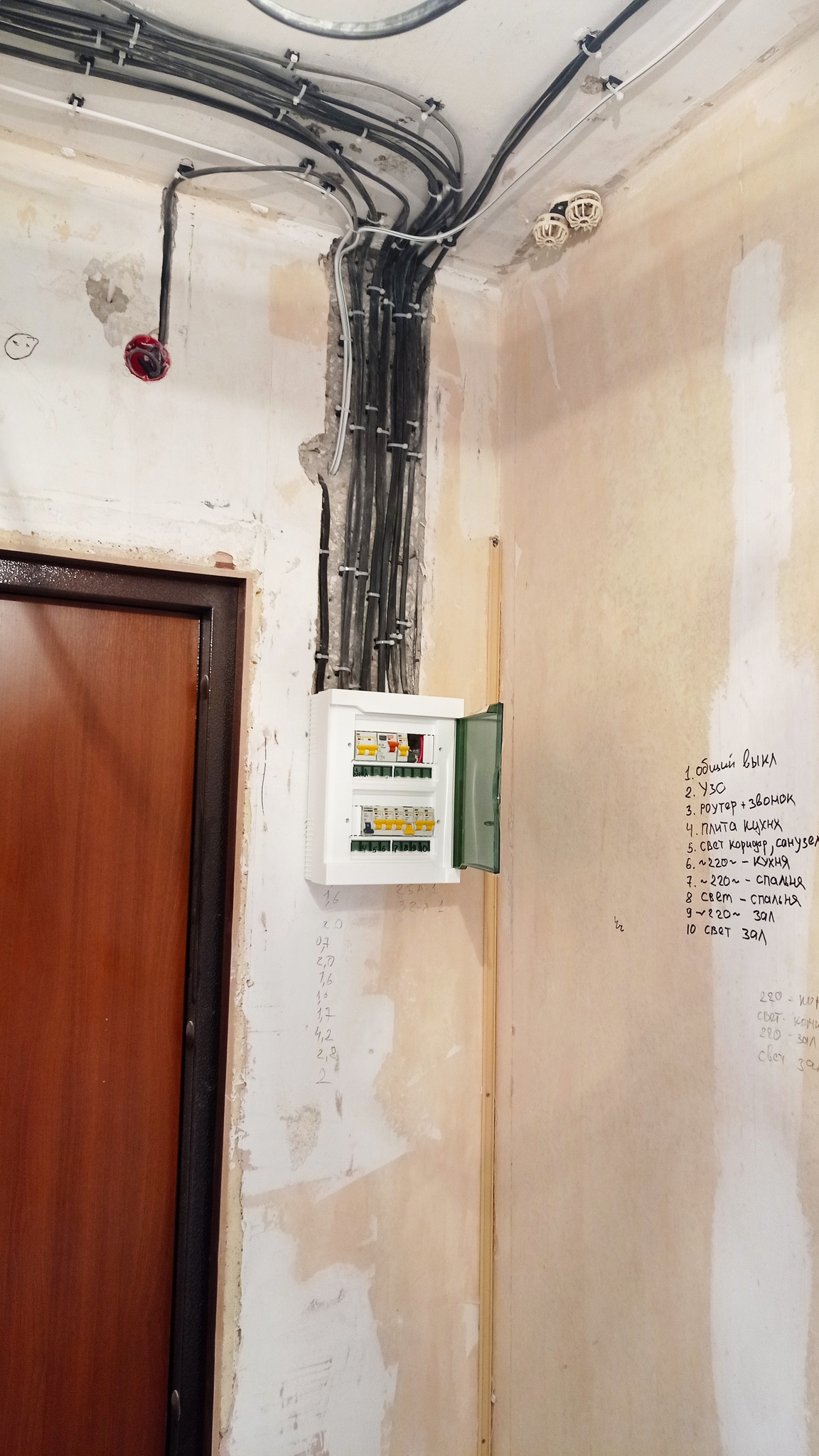 Замена электропроводки от щитка, перенос эл.щитка в квартиру,установка,розеток выключателей.